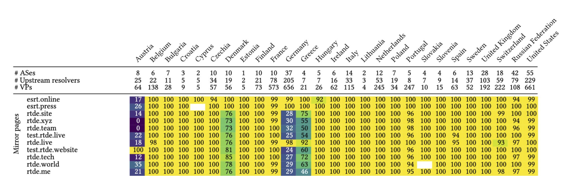 This might also be the reason why blocking in Europe does not follow a consistent pattern. Figure 2 shows blocking at ISPs. Each cell represents the percentage of unblocked responses per country and domain name received for DNS queries sent to ISP resolvers from RIPE Atlas vantage points. A bright yellow colour indicates that all or almost all queries from vantage points in a certain country towards a particular domain name were unfiltered. A dark purple colour indicates that most of our queries for sanctioned domain names were blocked.