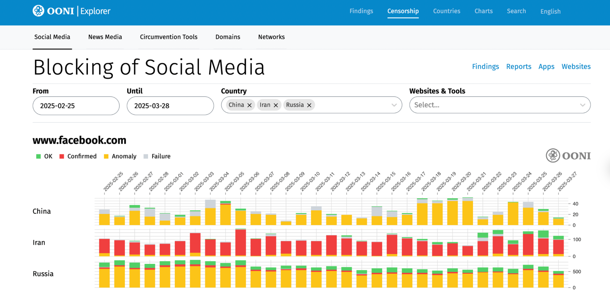 By default, these charts are filtered based on 3 countries: China, Iran, and Russia. We chose those countries because they have stable OONI measurement coverage and high levels of internet censorship, providing an opportunity to present more interesting charts (in comparison to other countries). OONI measurement coverage is available for most countries, and you can adjust the charts in these pages by changing the countries and date range (which is set to the past month by default). To better understand the charts, please refer to our documentation on interpreting OONI data.