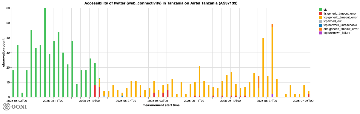 Starting from 20th May 2025, OONI data shows that the testing of X domains (twitter.com and x.com) on Airtel Tanzania (AS37133) primarily resulted in TCP timeout errors (suggesting IP-level blocks), as well as in a few TLS timeout errors.
