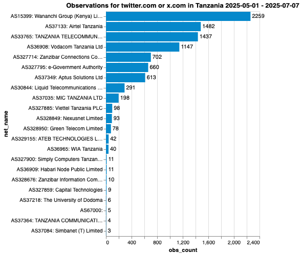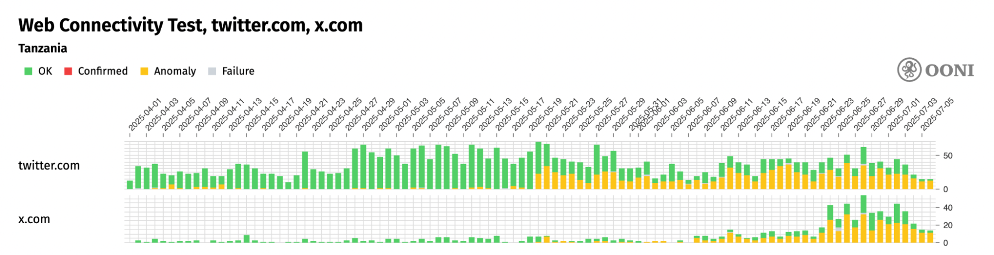 OONI data suggests that access to the social media platform X has been blocked in Tanzania since 20th May 2025.