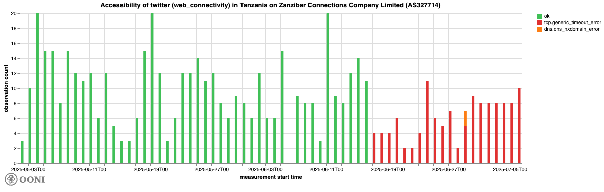 Chart: OONI Probe testing of X domains (twitter.com and x.com) on Zanzibar Connections Company Limited (AS327714) between 1st May 2025 to 7th July 2025 (source: OONI data).