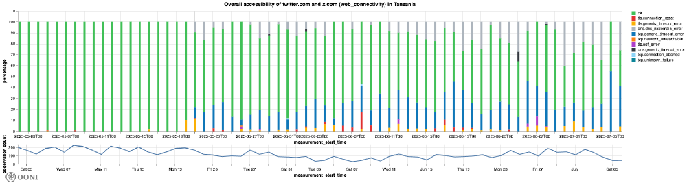 The following chart aggregates OONI measurement coverage from the testing of X domains (twitter.com and x.com) on multiple networks in Tanzania between 1st April 2025 to 7th July 2025.