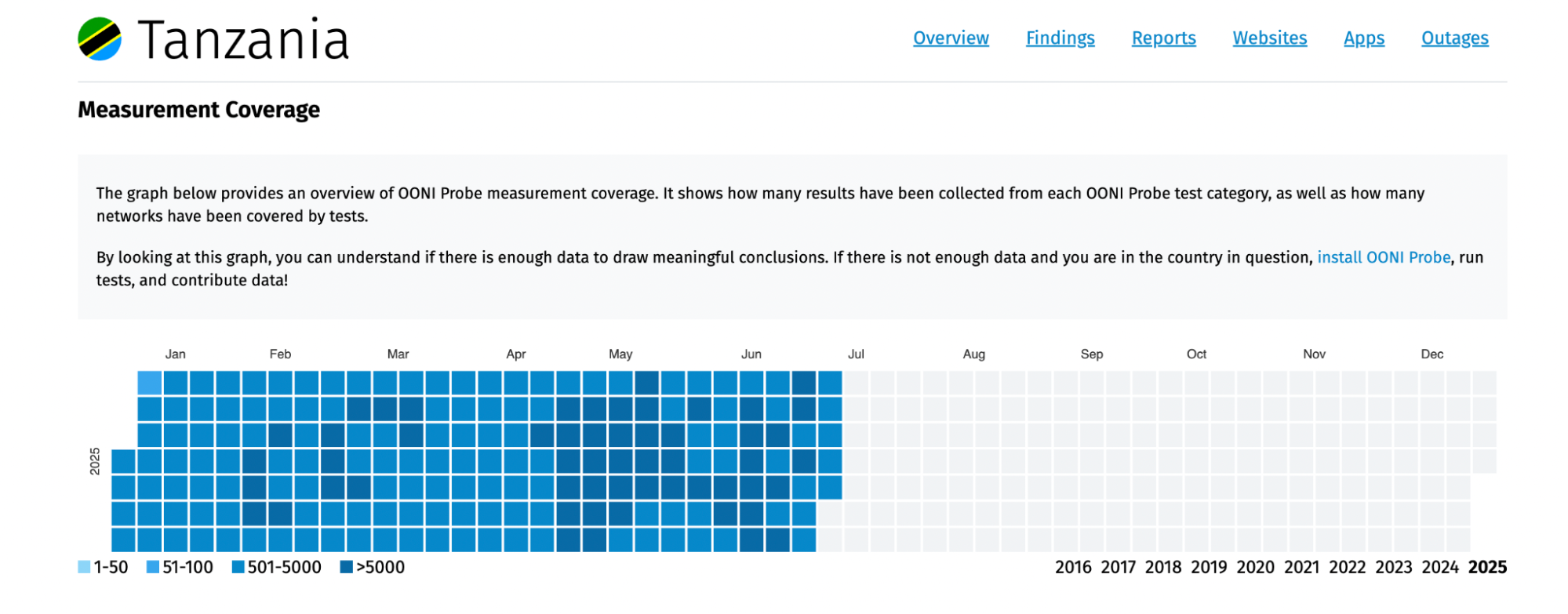 Chart: Overall OONI measurement coverage aggregated from all tested networks in Tanzania between early January 2025 to early July 2025 (source: OONI Explorer).
