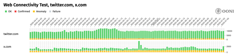 Chart: Global OONI Probe testing of twitter.com and x.com between 1st April 2025 to 7th July 2025 (source: OONI data).