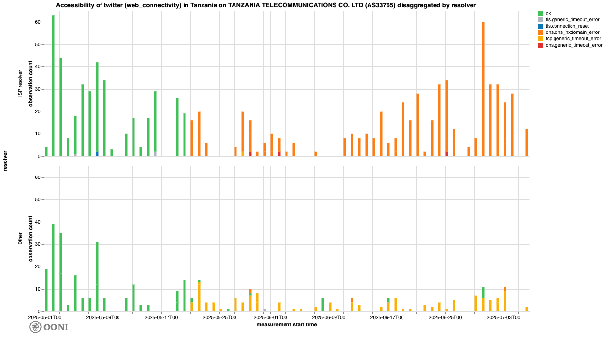 Chart: OONI Probe testing of twitter.com and x.com on Tanzania Telecommunications Co. Ltd (AS33765) between 1st May 2025 to 7th July 2025, disaggregated by resolver (source: OONI data).