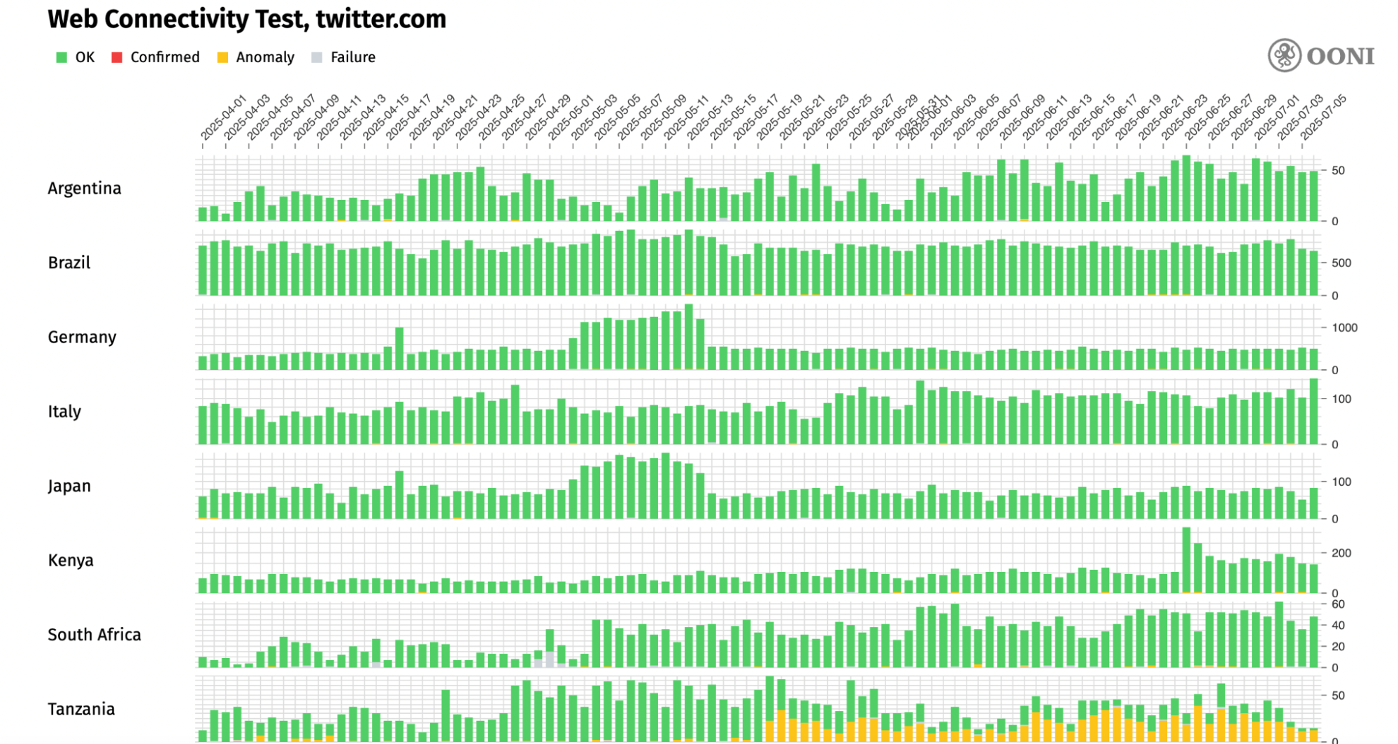 Chart: Comparative OONI Probe testing of twitter.com in Tanzania and other countries (Argentina, Brazil, Germany, Italy, Japan, Kenya, South Africa) between 1st April 2025 to 7th July 2025 (source: OONI data).
